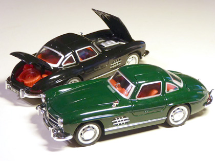 W 198 Flügeltürer, 1:32, Druckguß, Rückzugsmotor („Alloy Car Model Sound and Light Pull Back“), Räder schmal mit einfacher silberne Felgen/Radkappeneinheit; bewegliche Türen und Hauben, detaillierte Motornachbildung, IE rot, breite silberne Scheibenrahmen-Aufdrucke, Innenraum und Kofferraum-Inhalt (Ersatzrad) ein Bauteil, an- bzw. eingesetze Teile: Scheinwerfer, Rückleuchten, Rückspiegel, Stoßstangen, Grill; Schalter auf der Modell-Unterseite in der Stellung "Licht": LEDs in Scheinwerfern (weiß) und Rückleuchten (rot) leuchten, Schalterstellung "Sound": bei Druck aufs Lenkrad Motorgeräusch-ähnliche Tonfolge bzw. Doppelpiepton und kurzes Aufleuchten der Lampen, Batteriefach auf der Unterseite; schwarze Kunststoff-Bodenplatte mit Prägung "MADE IN CHINA"; OVP überdimensionierte Styropor-Box mit Aufklebern.